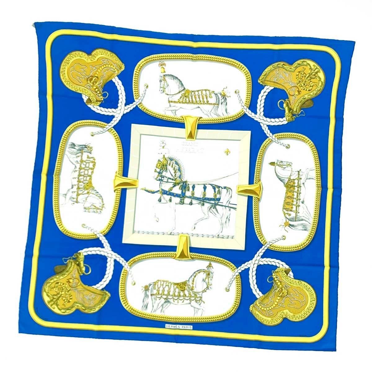 良好 HERMES エルメス カレ90 GRAND APPARAT スカーフ ブルー シルク100% レディース