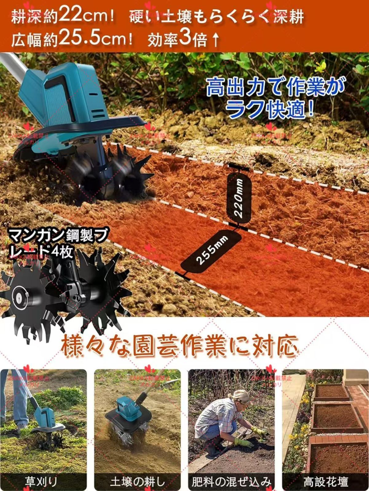 "【2025年最新モデル 充電式耕うん機】▼コードレスで▼軽量▼コンパクトな耕運機】家庭菜園や花壇での使用に便利なコードレスでコンパクトな耕運機です。軽量なので女性にも扱いやすいです。
