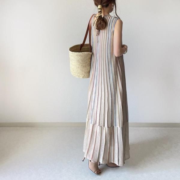 ワンピース 即 OK 夏 ストライプ ニット ノースリーブ クルーネック ジャカード KdJc 949