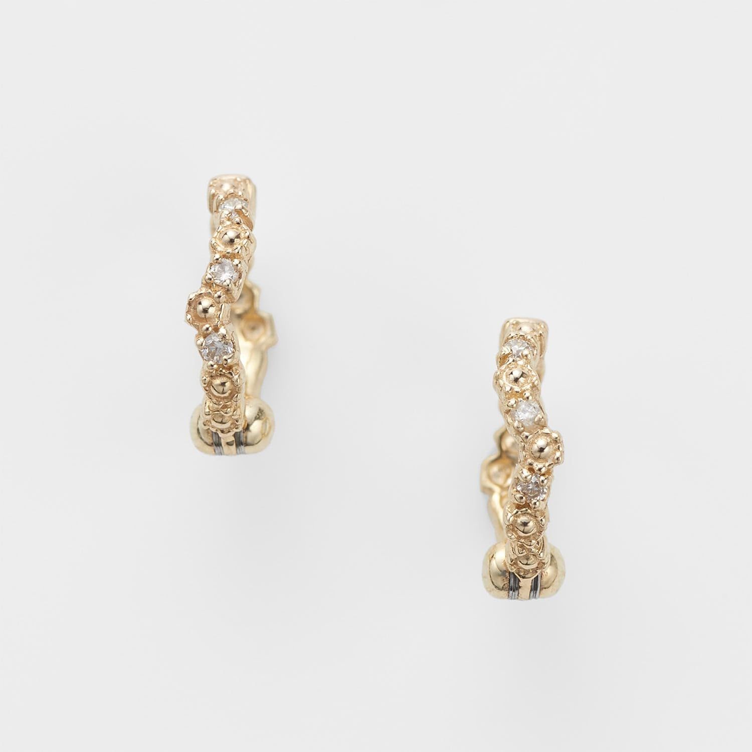 ねじ式のイヤリングより軽量で、スマートなピアリングは圧迫感もなく着けている違和感を感じさせない耳にフィットするイヤリングです。ギリシャの海辺に咲く花、カモミールからイメージ。リラックス効果のあるハーブとしても有名ですが、花言葉にも「あなたを癒す」といった意味があります。「大地の林檎」を意味する、カモミール。林檎のように優しく甘い香りをさせる可愛らしいお花がリズミカルに配置されたデザインです。
