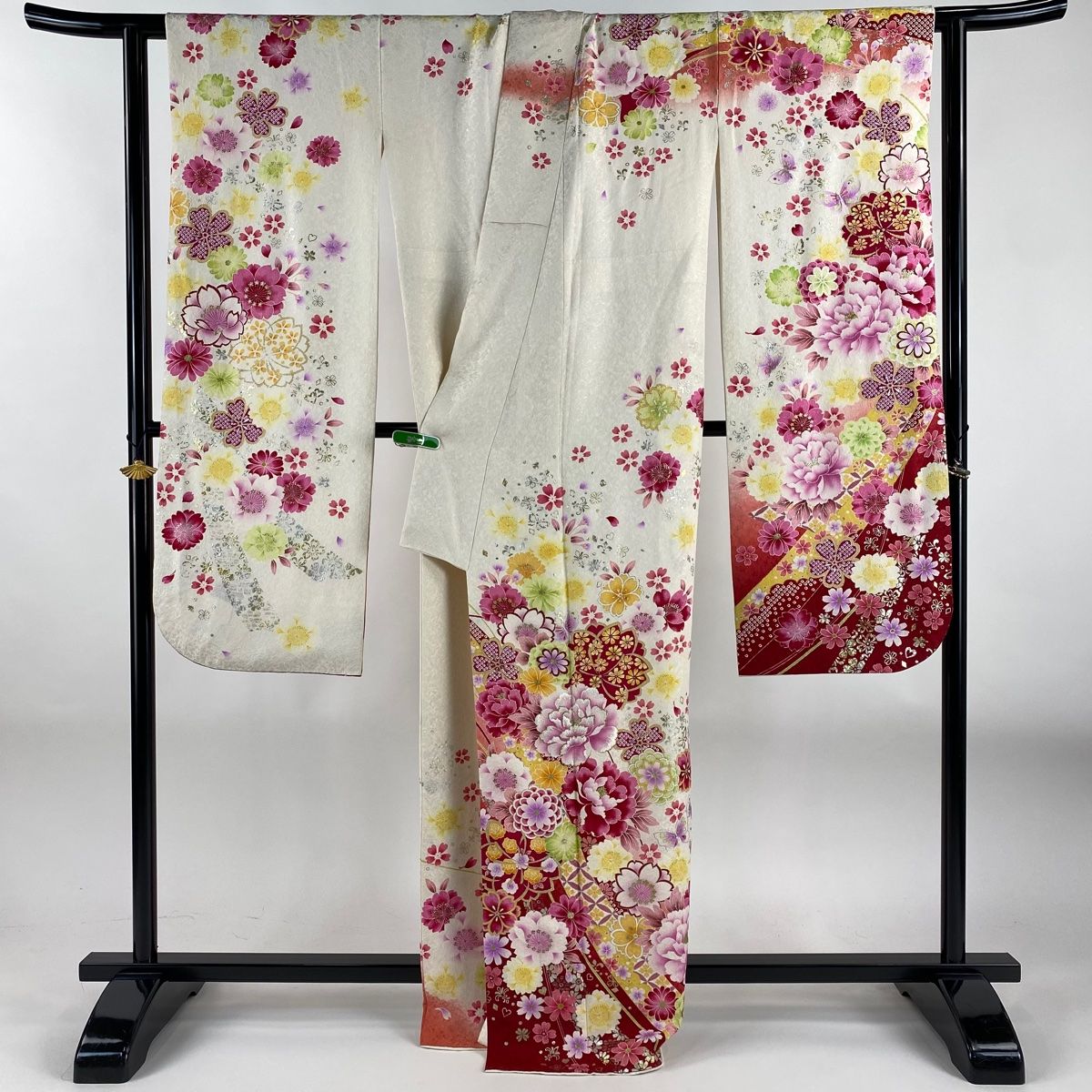 振袖 身丈166.5 cm 裄丈66 M 袷 牡丹 桜 銀通し 箔 灰白 正絹