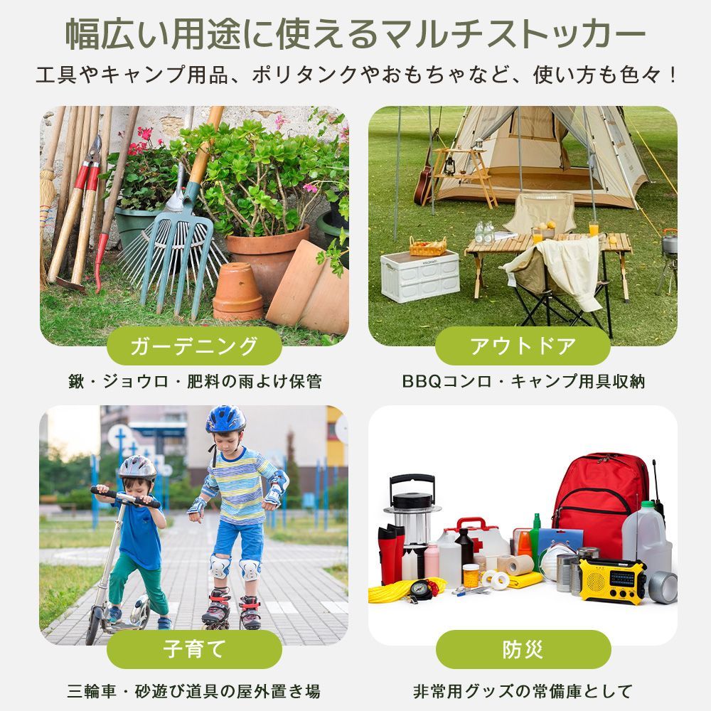 •【大容量でスッキリ収納】コンパクトサイズながら、2100Lの収納力を持ち、ガーデン用具や季節ごとのアイテムなど、室内に置きにくいものもすっきり整理できます。園芸道具・植木鉢・クリスマスの飾り・夏のビーチ用品なども収納可能です。空間を有効活用しながらすっきりとした生活環境を手に入れられます。