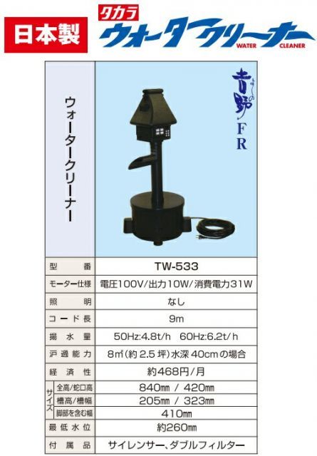 ウォータークリーナー 池ポンプ 循環ポンプ 吉野FR TW-533 濾過器 池用ポンプ ろ過装置 池ろ過器 大型