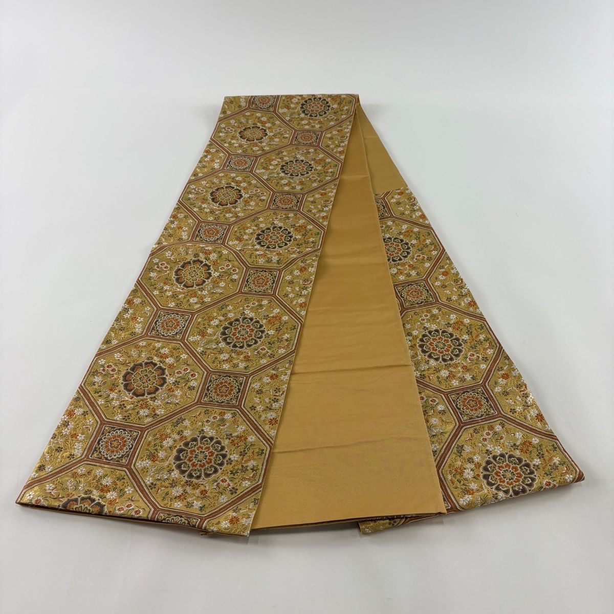 袋帯 秀品 鈴乃屋 燭甲小花錦 蜀江華文 花鳥 箔 金銀糸 金色 六通 正絹