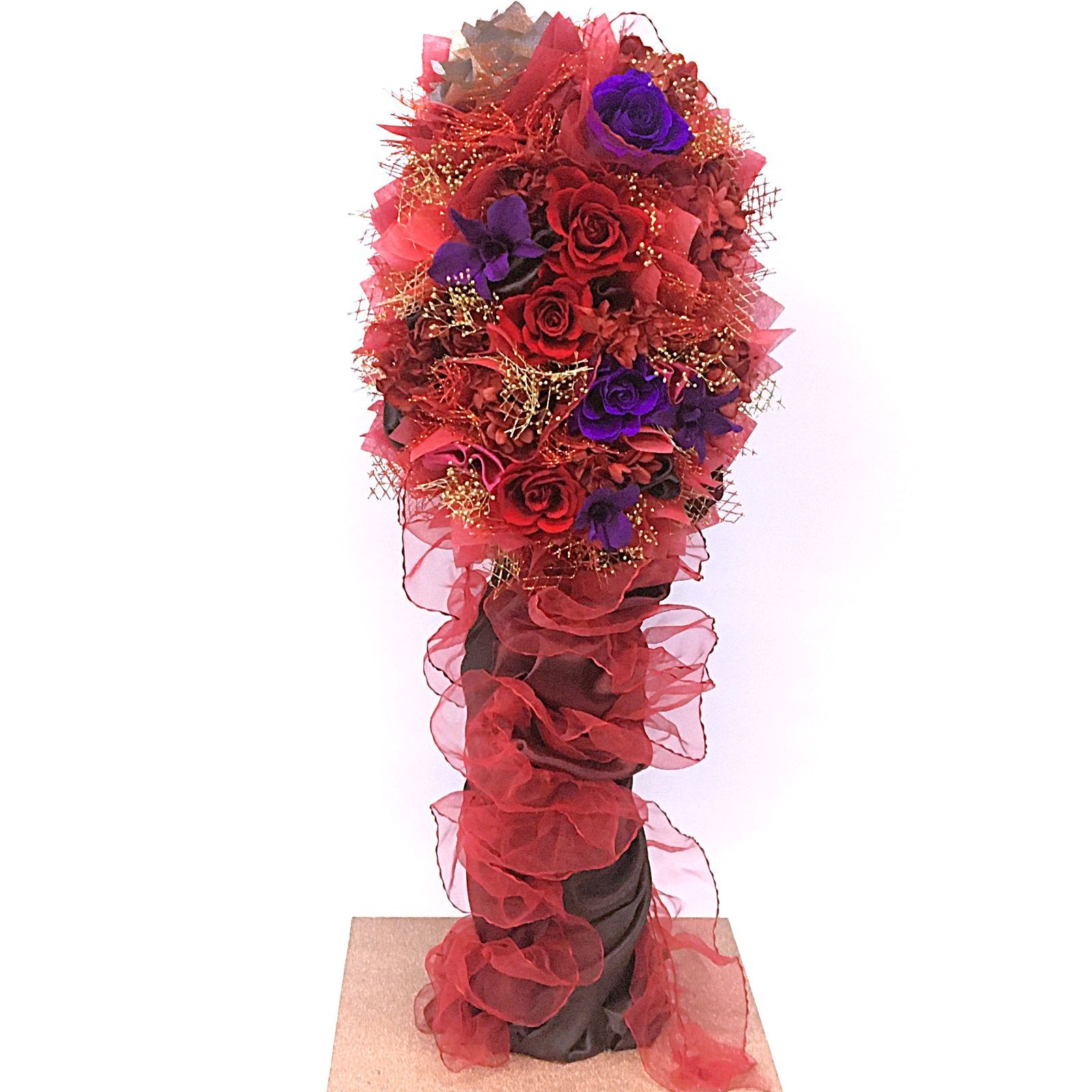 トロフィー型アレンジメント(レッドパープル)A-037は、シックな赤と妖艶な紫が見事に調和した特別なフラワーギフトです。重厚感のあるデザインが特徴で、どの角度から見ても美しい魅力を放ちます。大切な方へのギフトとしてだけでなく、お部屋のインテリアとしても素敵な存在感を演出します。