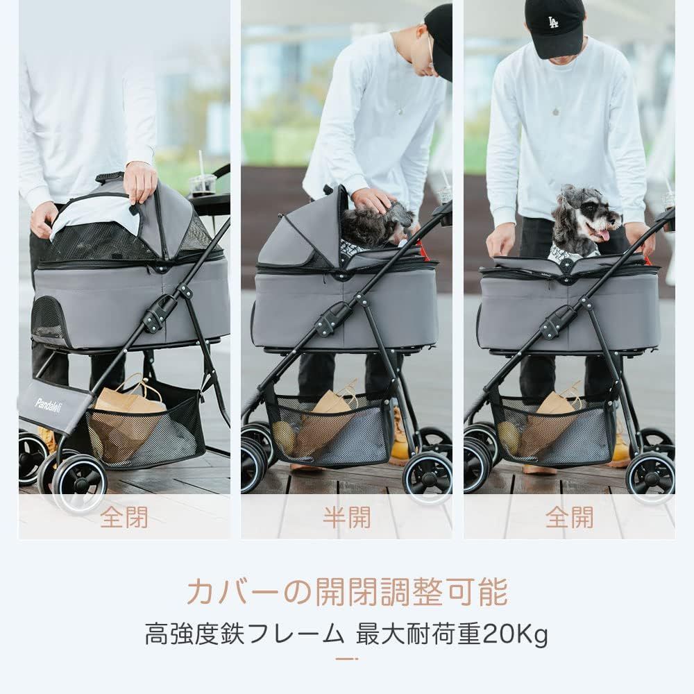 Pandaloli ペットカート ベビーカー 犬 バギー 小型犬 中型犬 猫 多頭 カート 4輪 軽量コンパクト 飛び出し防止リード2本付き 前輪360°回転 後輪ブレーキ付き 折りたたみ 組み立て簡単 耐荷重20 Kg グレー色