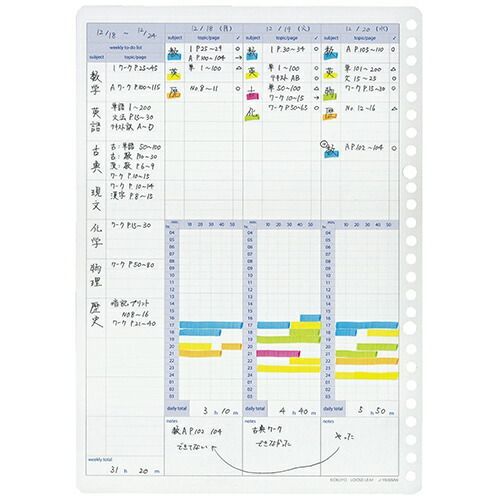 ●テスト前勉強、受験勉強などの勉強スケジュール管理に便利なルーズリーフです。●1週間の勉強スケジュールを見える化できます。●ウィークリー罫みえる化タイプの特長/1.1週間の予定スペースで、まずは1週間のやることを書き出すことができます。2.1週間の予定スペースで書き出した勉強のスケジュールを1日ごとに振り分けられます。3.24時間スケジュール表で何時に何を勉強するのか色分けできます。4.チェックスペースでその日のでき具合とトータル時間を確認できます。5.メモスペースは振り返りや次の日の意気込みなど自由に記入できます。●筆記の邪魔にならない濃さのグレーの罫線です。●項目欄は青の塗りつぶしです。●見開き1週間の仕様なので、一目で1週間の勉強スケジュールを確認できます。●筆記にオススメなオリジナル原紙/「さらさら」の原紙はにじみにくく、インクが裏に透けにくいコクヨオリジナル原紙を使用しています。また、長期保存に適した中性紙です。●パッケージの裏面では、使い方の詳細が記載されています。【検索ハッシュタグ】#ダイアリー#手帳#スタディプランナー#