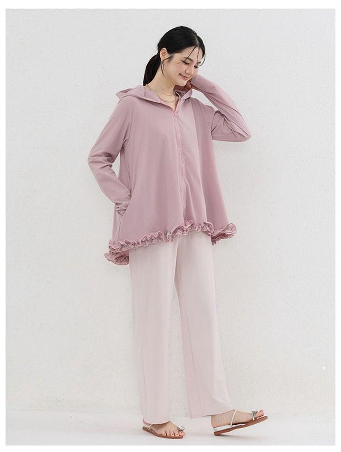 水陸両用フリルラッシュガード UVカット日焼け防止 水着 ラッシュガード レディース フード付き 長袖 トップス 速乾 ママ 体型カバー フリル フ UVパーカー 接触冷感 2 lE 7606