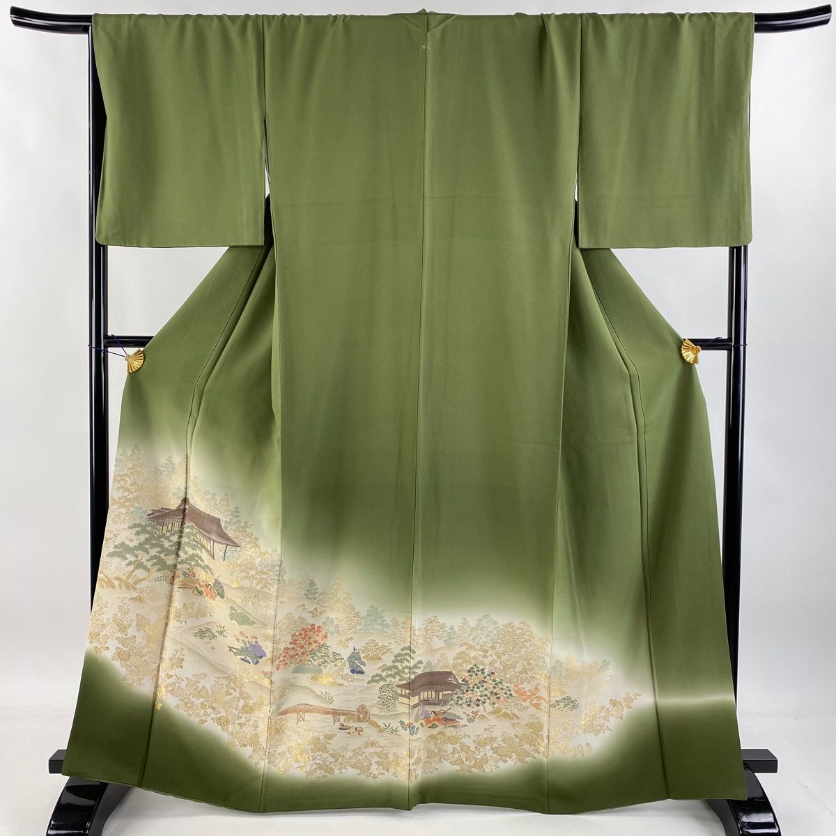 色留袖 身丈165 cm 裄丈70 L 袷 建物 人物 金糸 ぼかし よもぎ色 正絹 秀品 一つ紋
