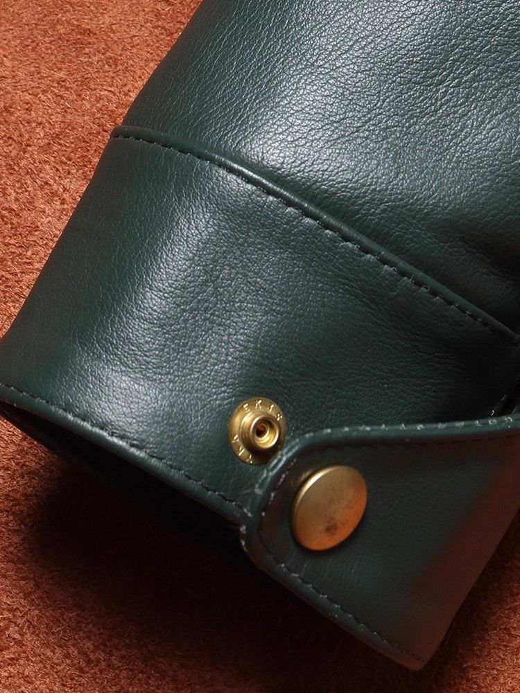 こちらは**グリーン透染め頭層牛革(フルグレインレザー)**を使用した高品質なレザージャケットです。