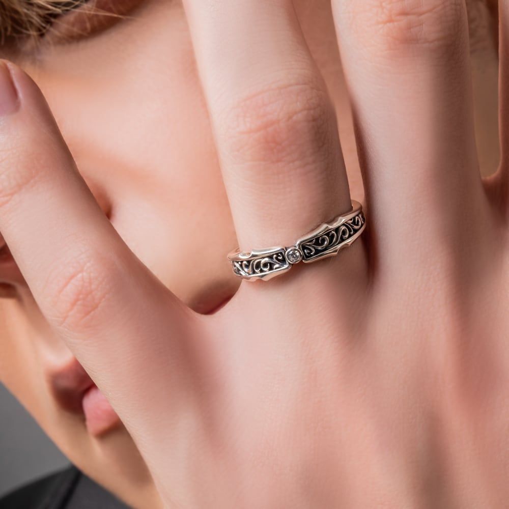 The jet-black arabesque pattern merges seamlessly with the gleam of silver, creating a ring of undeniable presence. At its center, a single round brilliant-cut stone radiates a serene brilliance, harmonizing with the intricate curves of the design. The interplay of shadow and delicate engraving strikes a balance that is at once timelessly classic and subtly avant-garde, leaving an imprint of intent and refined taste on the wearer’s hand.