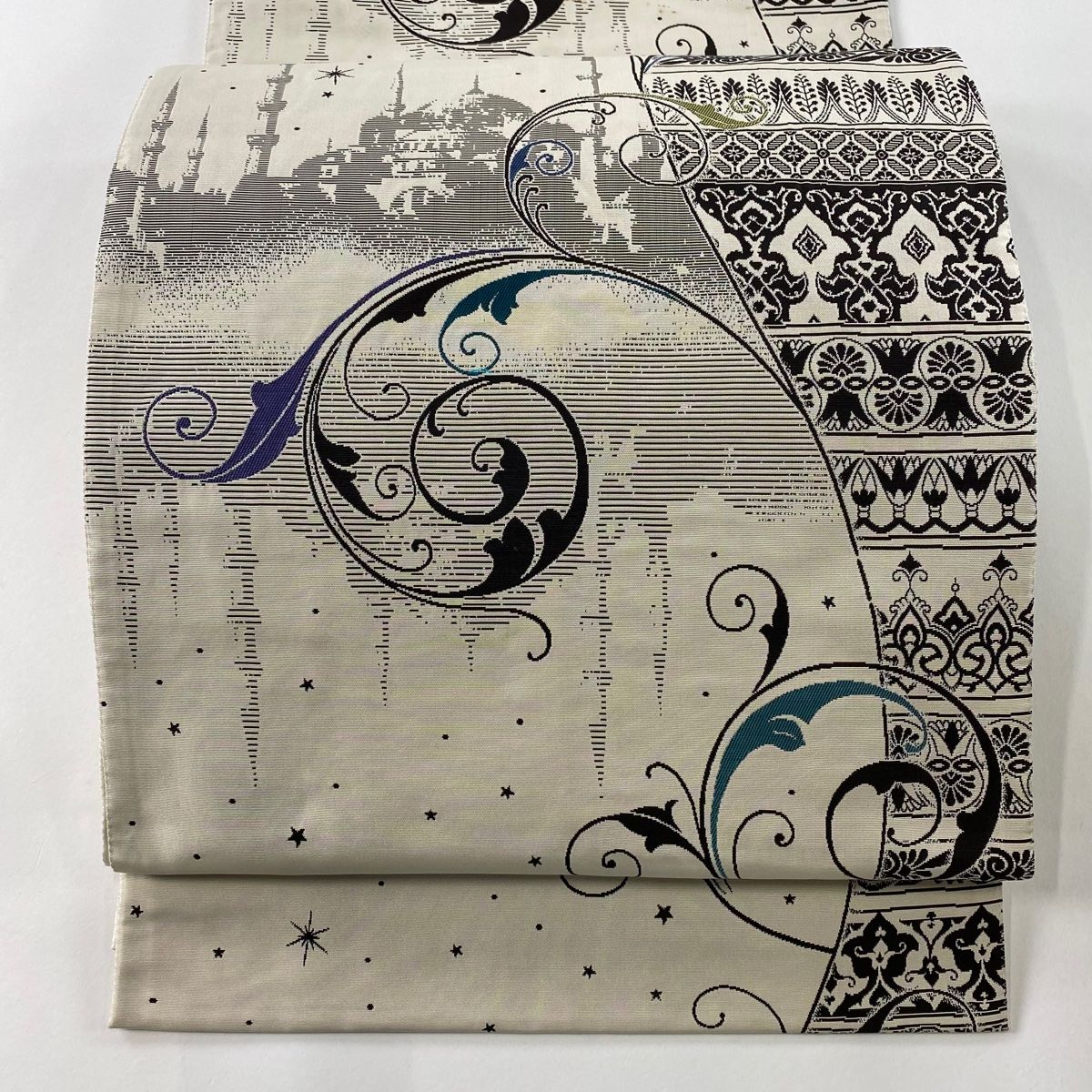 袋名古屋帯 建物 唐草 クリーム 正絹