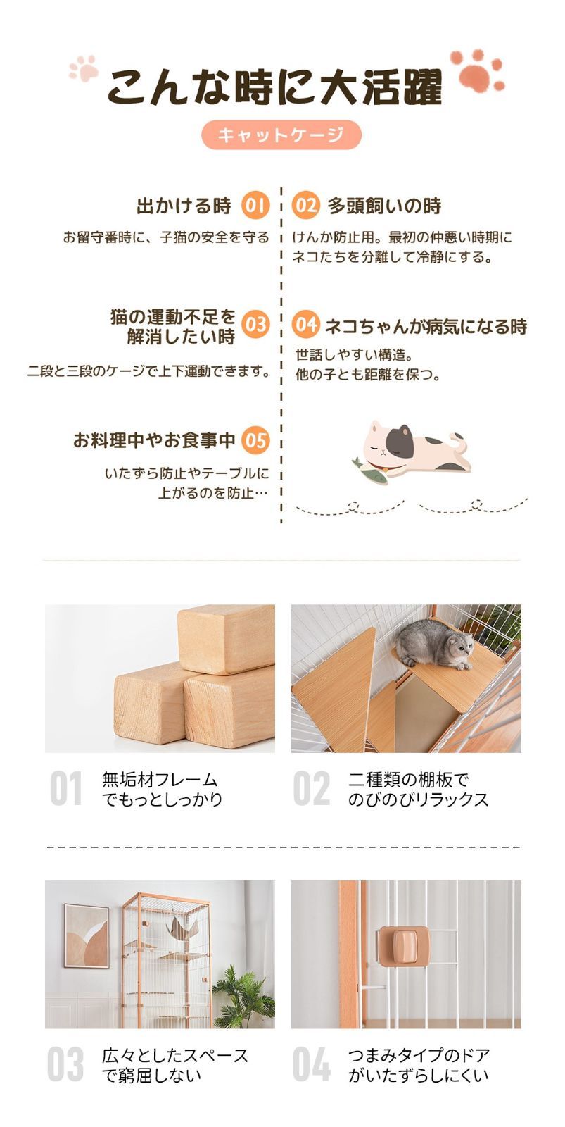 猫 ケージ キャットケージ 2段 木製フレーム ハンモック付 広々 大型 猫ゲージ 感 おしゃれ キャットハウス ネコ ハウス 多段 留守番 脱走防止 多頭飼い 多頭 スチール ペットケージ ナチュラル