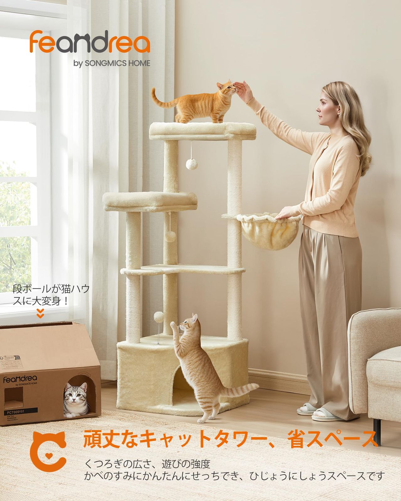 Feandrea キャットタワー 猫タワー 大型ハウス付き 広い見晴台 大型猫 据え置き 登りやすい コーナー型キャットタワー 子猫から老猫 多頭飼い対応 天然麻紐 爪とぎ 運動不足解消 高さ140 cm ベージュ
