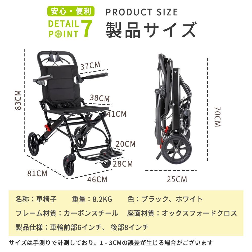 この車椅子は折りたたみ式で、非常にコンパクト。持ち運びが楽で、車のトランクにも収納しやすく、電車や新幹線、飛行機への持ち込みも簡単。外出や旅行に便利で、普段は使用頻度が低くても、いざという時に備えておきたい一台です。