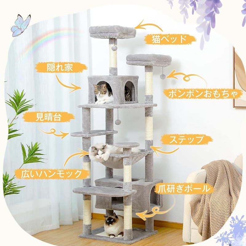 ぺテぺラ キャットタワー 大型猫用 コンパクト 多頭飼い 据え置き型 スリム ハンモック 麻紐爪とぎポール 猫のおもちゃ 転倒防止ベルト付き 展望台 猫ベッドカバー取り外し 運動不足解消 - 高さ180 cm グレー 1