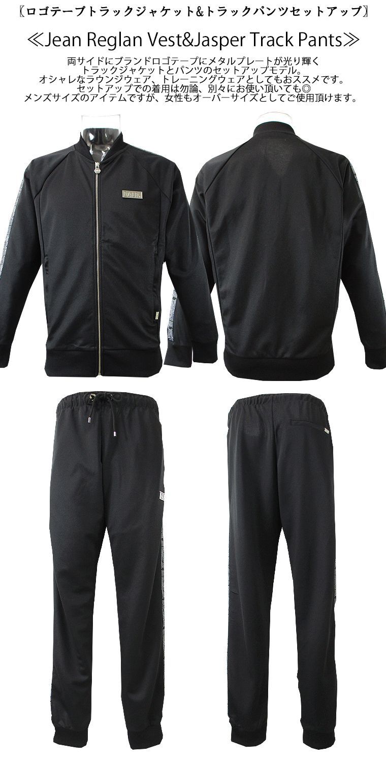 両サイドにブランドロゴテープにメタルプレートが光り輝くトラックジャケットとパンツのセットアップモデル。
