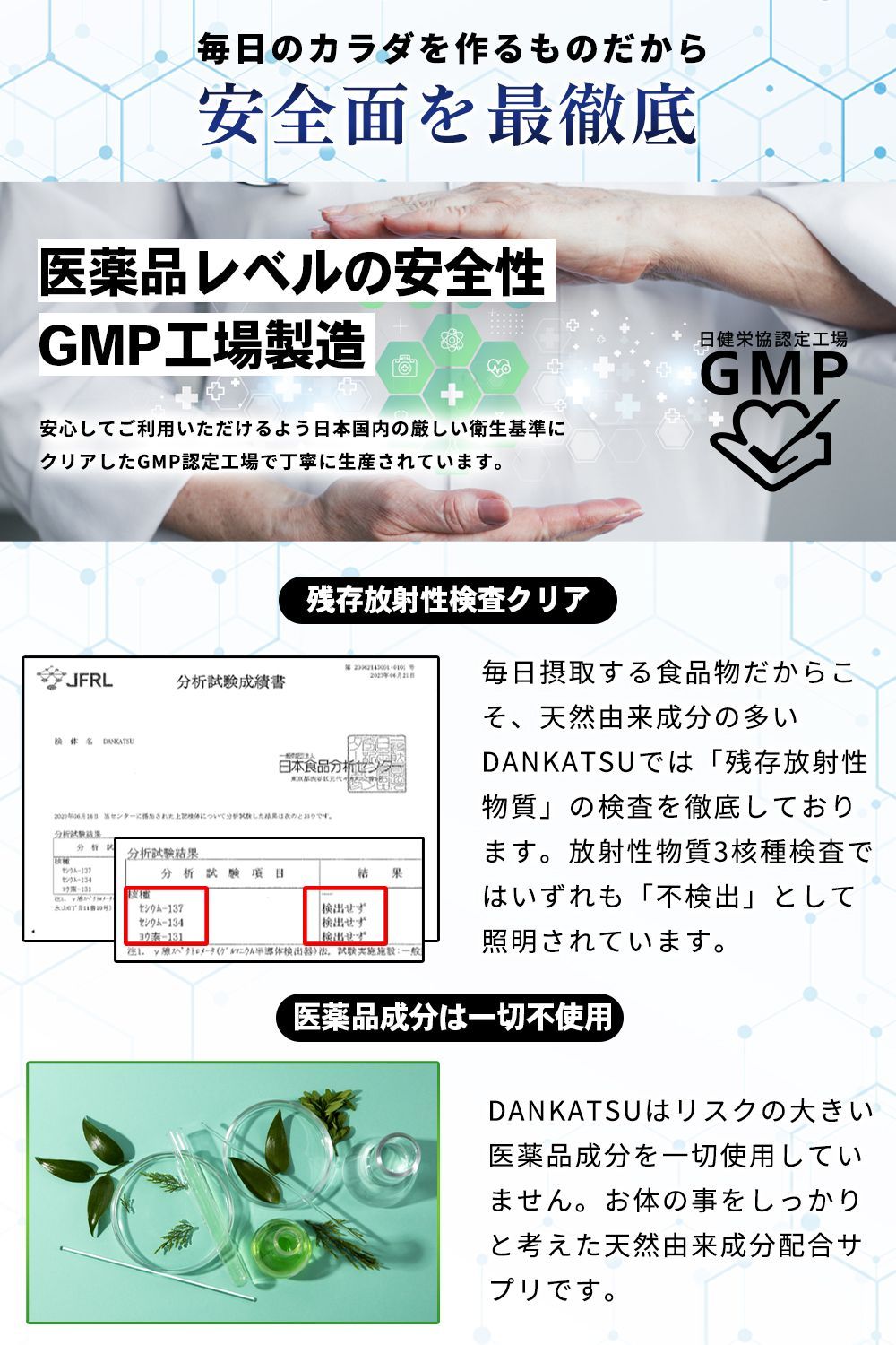 【安全性を追求】国内工場のなかでも厚生労働省の「健康食品GMPガイドライン」に基づいて審査・査察を行い認定されたGMP認定工場のみで製造しています。天然由来成分の多いDANKATSU(ダンカツ)では原料の安全性も追求し、残存放射性物質の検査を実地。全ての項目で「不検出」という結果で、安心してご利用いただけます。