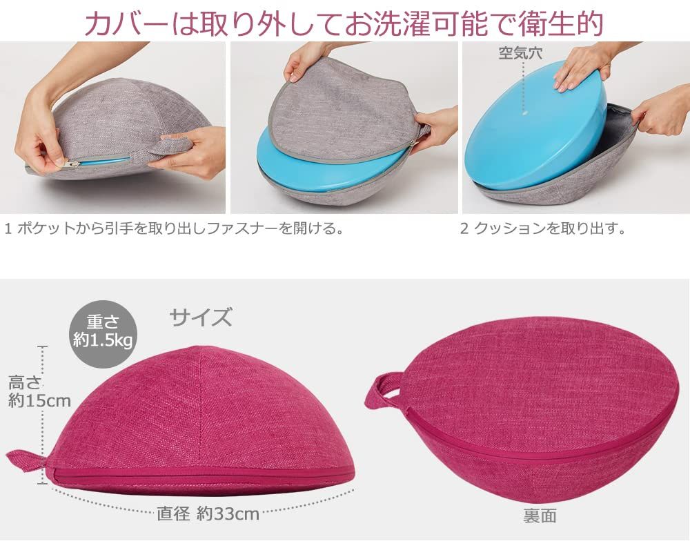 座ったその場で場所を取らず座る時間がジムタイムに早変わり!【ドーム型の形状で骨盤が立つ】ドームの傾斜と高さにより、座ると上半身が前傾斜になるので骨盤を立てやすい。骨盤が立つことで、背すじが連動して伸び、背筋が刺激されるため、良い姿勢を意識しやすい。【エアー内蔵】エアーの反発力で、重心が沈みこみすぎることによる姿勢の崩れを防止する。さらに座面の不安定さにより自然と体幹筋を刺激する。【座る】ただ座っているよりバランスを保とうと体幹が使われることで運動量がUP!【ゆらゆらする】左右にゆれる動きを加えることで更に運動量がUP!【筋トレ】お腹まわり、下腹、足首、腹筋、お尻の筋トレもできちゃう!(カラーのエクササイズガイド付き)【ストレッチ】丸いカーブの形状がサポートになり深いストレットが可能になる。【おしゃれなデザイン性】インテリアとしてお部屋に馴染むデザインだから出しっぱなしでOK。【衛生的】取り外してお洗濯できるカバーです。【商品名】ながらクッションDome
