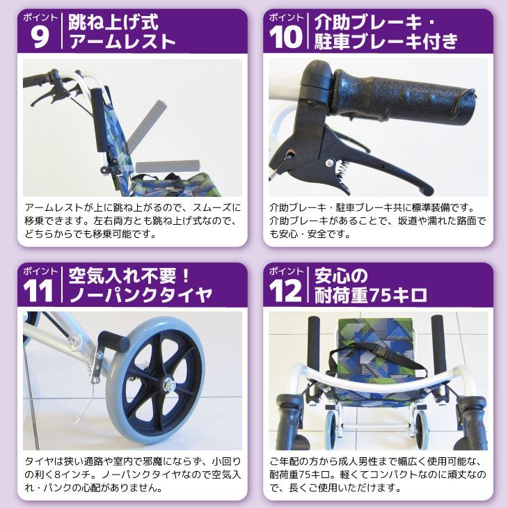 ■ 旅行先や外出先でも活躍してくれる簡易式車椅子です■ 人気のノーパンクタイヤ■ 女性でも片手で持てる重さです■ 補助ベルト付ですので、軽くても安定感抜群です■ 車のトランクに常備でも邪魔になりません■ 介助ブレーキ付■ エレベーターの中でも方向転換が可能です■ 折り畳み時 厚み約35cm 高さ約71cm 横幅約52cm ■ TAISコード取得済製品 01636 - 000005