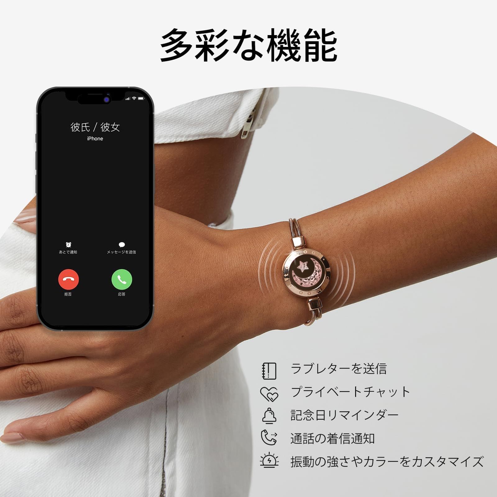 【遠距離でも心繋がる絆】 どこにいても愛する人の存在を常に感じられるペアブレスレット。軽くタップするだけで相手のブレスレットが光り、優しい振動が伝わり、まるでテレパシーのように心を通わせます。遠距離恋愛や大切な人との絆を深める、革新的なコミュニケーションを実現します。