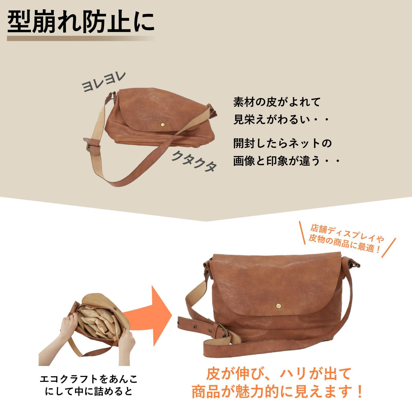■梱包用紙を丸めるといった方法よりも、本製品であれば梱包の見栄えが一段とよくなります。クラフト紙特有の温かみがある見た目で、お客様からの印象UP!