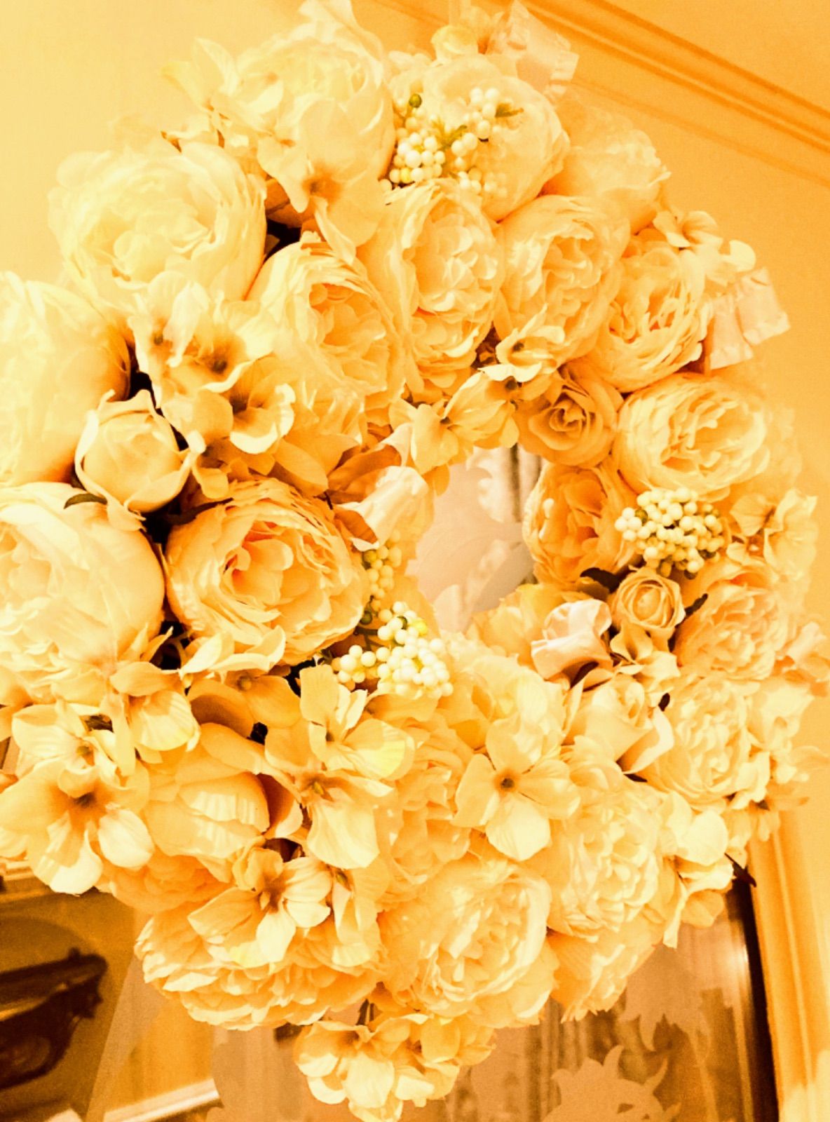 アスカ商会の上質アーティフィシャルフラワーを使用した、ロココ調のローズとイエローフラワーのリースです。