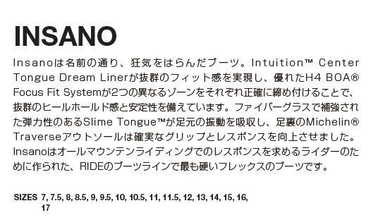 Insanoはオールマウンテンライディングでのレスポンスを求めるライダーのために作られた、RIDEのブーツラインで最も硬いフレックスのブーツです。