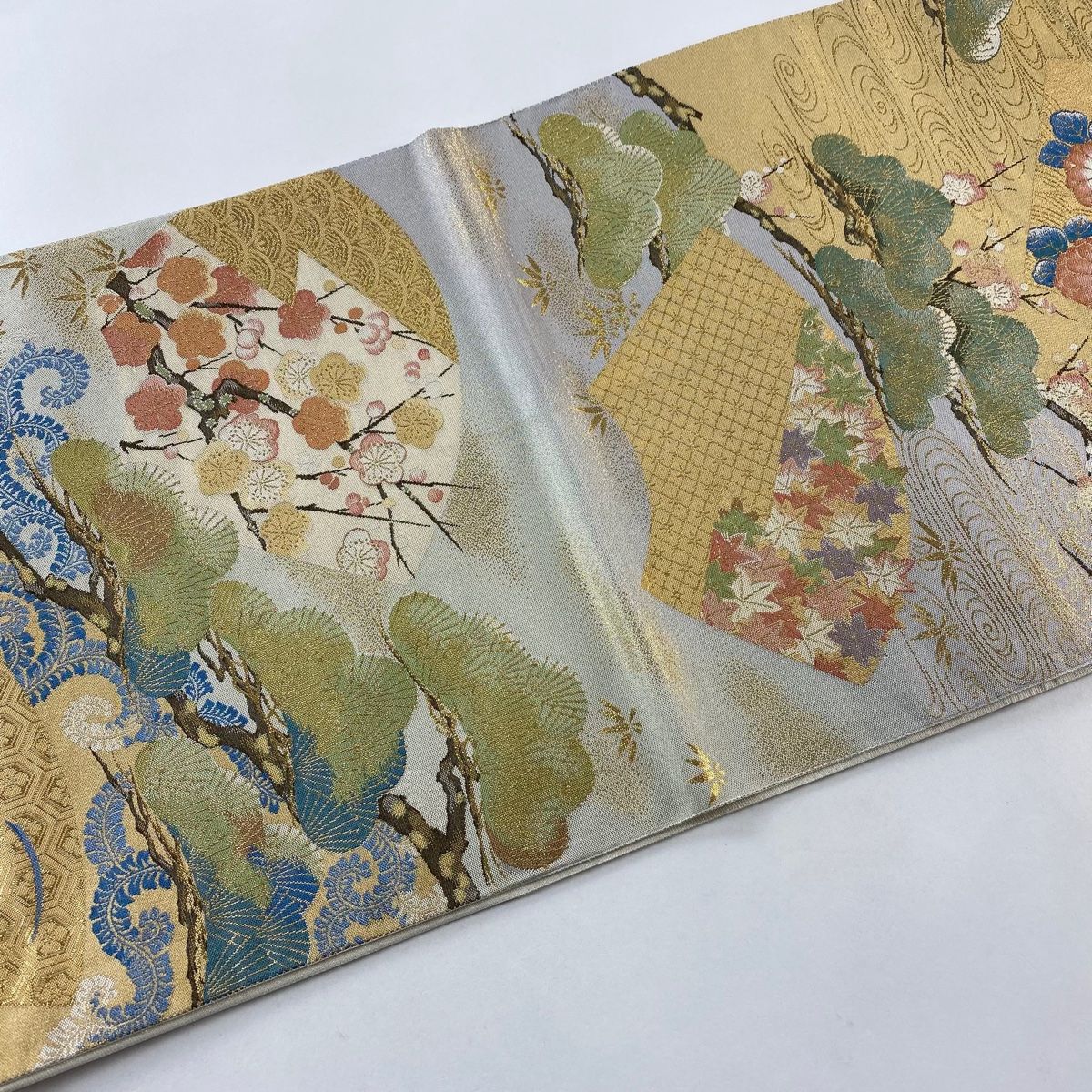 袋帯 秀品 扇面 松 箔 金糸 灰色 六通 正絹