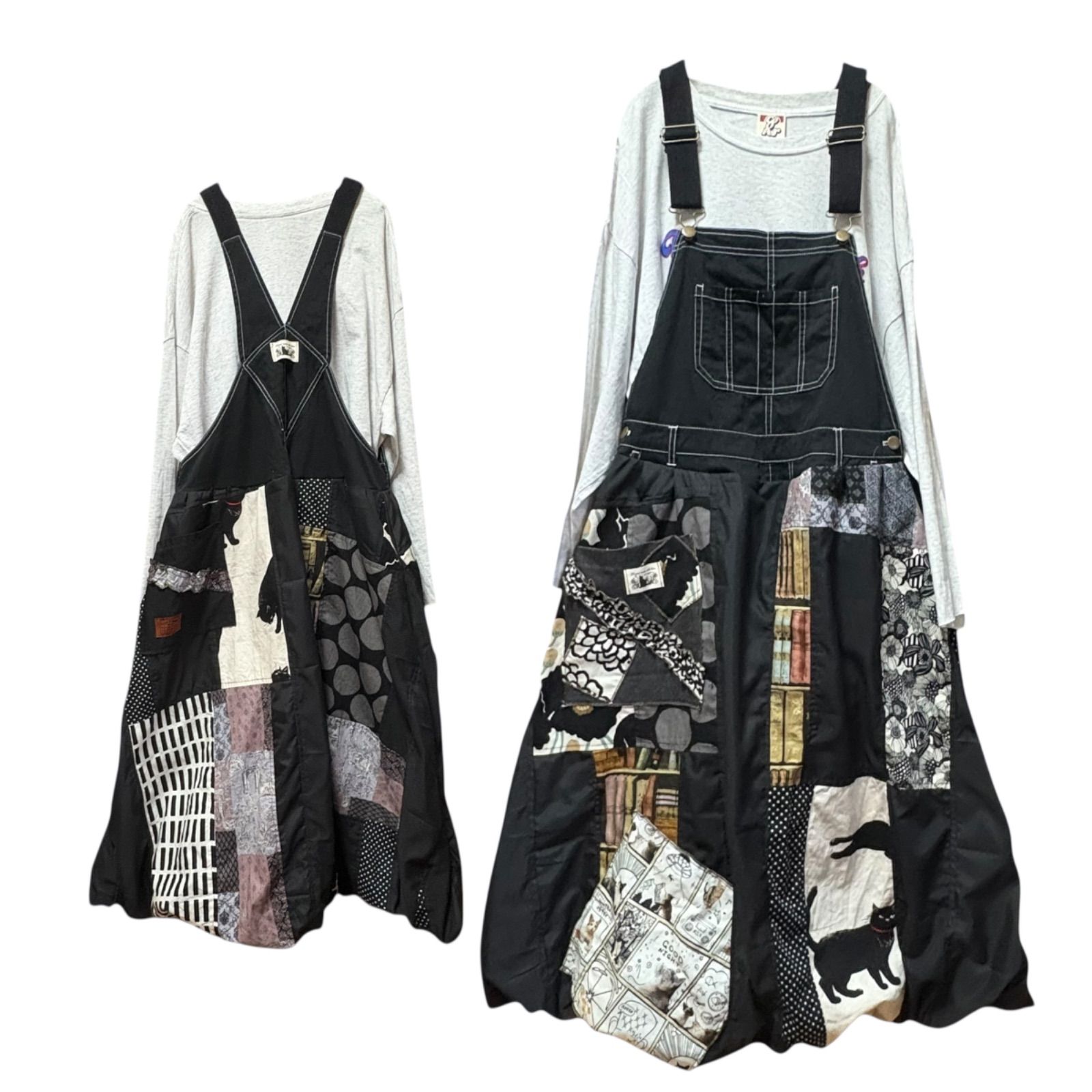 M 軽量ブラックサロペット バルーンスカート 黒猫北欧系ファブリックモノトーン 小柄さん ドッキングワンピース ふんわり軽量 猫柄布タグビックポケットパッチワーク 古着リメイク