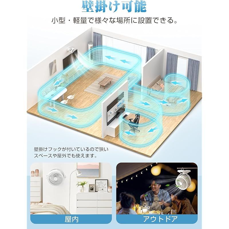 ??【壁掛け&タイマー機能&Type-C充電式】壁掛けサーキュレーターは、エアコンのように壁の上部に設置するため、場所をとらず邪魔になりにくい。(壁掛け部品含む)床面積を圧迫しないため、狭い部屋でも問題なく設置可能です。?またオン/オフタイマーが付いており、??~12時間まで幅広く調整できる(1時間単位で設定できる)。起床時間や帰宅時間に合わせた空気の循環が可能、就寝時の冷え過ぎ防止などにも活用できます。???最新のType-C充電で、コンパクトで使いやすく、家だけでなくオフィスやキャンプでも使用可能。