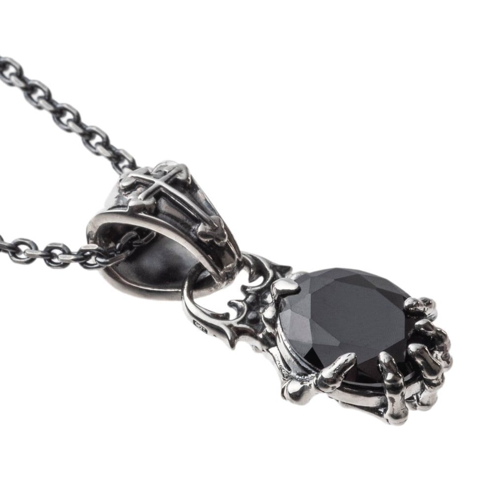 髑髏の手が一粒のブラックCZをつかむ、アイコニックなペンダント。関節や骨の起伏まで精密に彫り上げ、ミニチュア彫刻のような存在感を胸元に灯します。石は深い艶で光を抱き、モードな陰影を演出。裏面にはブランドサインと〈925〉の品質刻印を配し、確かなクオリティを証します。仕立ては、アトリエで一点一点成形・彫刻・磨きを重ね、肌に触れる面まで滑らかに整えました。小ぶりでも印象は鮮烈。Tシャツにもジャケットにも映える、装いの重心になる一本です。※ペンダントトップのみ(チェーン別売)。