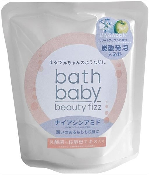 まるで赤ちゃん肌の炭酸バスボール。保湿成分と炭酸成分がぎゅっと詰まった入浴剤。乳酸菌&桜酵母エキス配合。お肌に潤いを与えるナイアシンアミド配合。乳白色の湯。甘いリリー&アップルの香り。1回分。