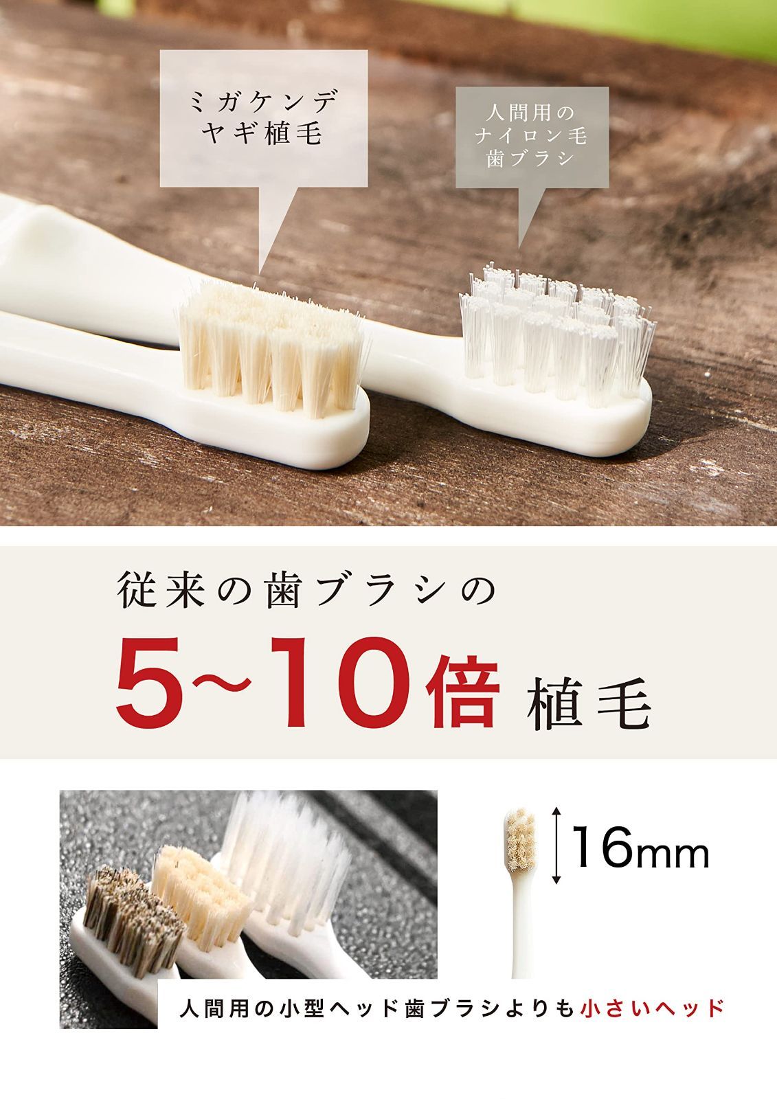 【獣医師と共同開発】ミガケンデは、歯ブラシメーカーの社長自身が愛犬の全身麻酔での抜歯を目の当たりにしたことがきっかけで開発されました。長年の製造ノウハウと獣医師のアドバイスを融合し、飼い主さんにとってもワンちゃんにとっても安全安心で、使いやすい犬用歯ブラシを作りました。歯磨きの際に歯ブラシを噛んでしまうことの多いペット用として、天然毛は『飲み込んでも安心』です。刺激が少なく歯と歯茎にとても優しいやわらかい素材ですが、しっかり歯垢がとれるよう従来の5?10倍多く植毛しています。