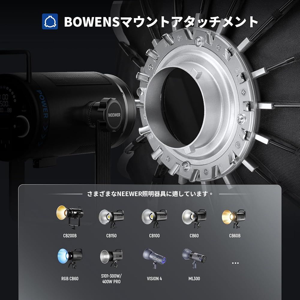 【Bowensマウント経由で取り付け】ソフトボックスはBowensマウント経由で接続すると、Aputure 120d、Godox sl60w 、RC 120D RC 120B、 NEEWER MS60C、MS60B、CB200B、CB150、CB100、CB60、RGB CB60、CB60B、S101-300W PRO、S101-400W PRO、Vision 4、Vision 5に対応し、およびその他のスタジオストロボライトとBowensマウント付き連続LEDビデオライトにも最適です。