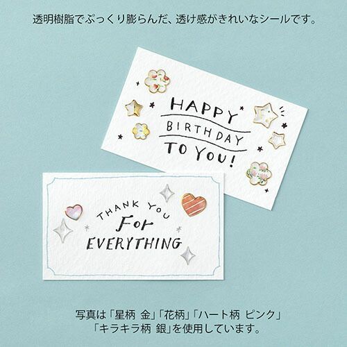 レジン(樹脂)の透明感と立体感を生かしたシールです。幅広く使いやすいモチーフとアクセサリーのようなデザインが魅力です。手紙やカード、ノートの表紙などを可愛くデコレーションできます。星柄はレジンの透明感とゴールドの箔の組み合わせが綺麗です。【検索ハッシュタグ】#ミドリ#デザインフィル#シール#レジン#レジンシール#樹脂シール#金#ゴールド#星#スター