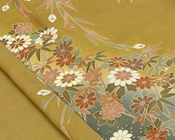 花縫取り地紋の黄朽葉色地に錆鼠の裾ぼかしと渋めローズピンクや錆茶・渋め薄紫色などの多色や金箔・金駒で四季花模様が柄付けされています。