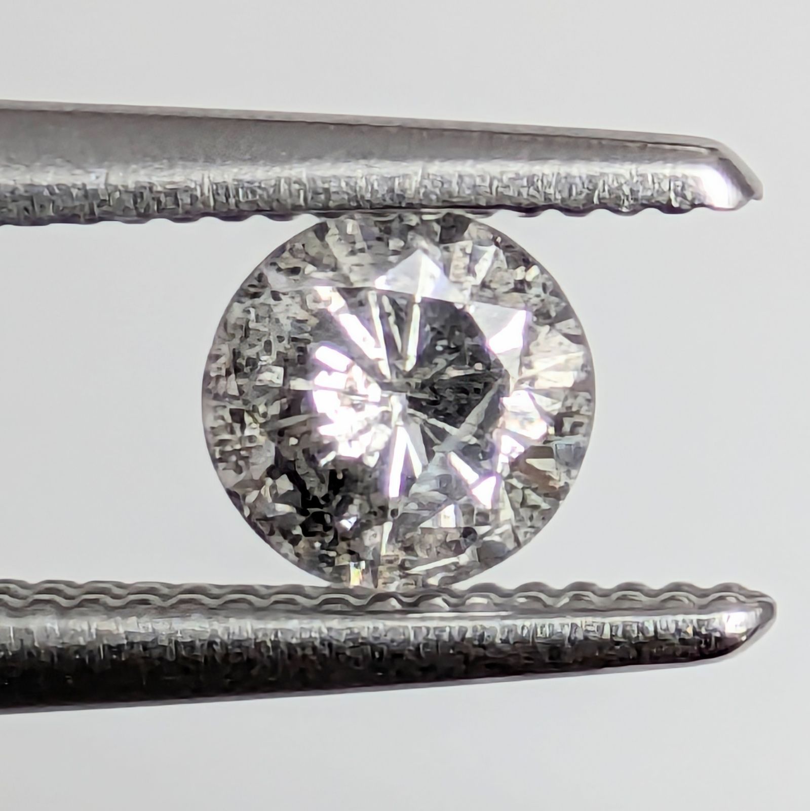 都会のコンクリートから、ギュッと絞り出した一滴のような、淡いグレーの輝き。「I-2」で、“カーボン”と呼ばれる黒いインクルージョンがたくさん入った1ピースです。えっ?それを嘆いてはいけません。宝石に内包されたインクルージョンは、出会うはずのなかった太古の時間と私たち人間との軌跡の邂逅。結晶で隔てられて決して触れ合うことはできませんが、ファセット面の窓越しに見つめ合う、そんなロマンチックな時間が流れているのです。