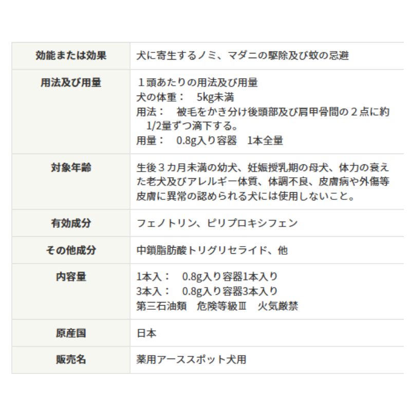 用法:被毛をかき分け後頭部及び肩甲骨間の2点に約1/2量ずつ滴下する。