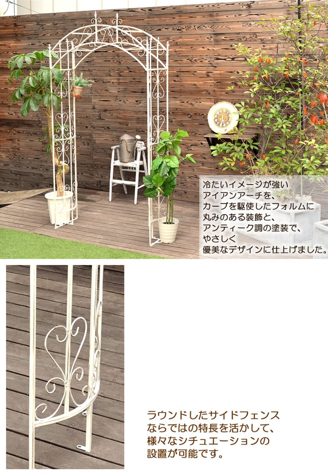 当店大ヒットフェンスのアイアンローズフェンスの流れをくむ優美なアイアンアーチ!つるバラを植えたり花鉢を置いたりと使い道が広がるラウンドしたサイドフェンスは外向き内向きどちらでの組立も可能。丸みをもたせたエレガントな装飾でカラーは上品なアンティークホワイト、サビ風の汚し加工を施してあります。足元は重石による簡易固定とペグ式で固定が可能で、ペグも付属しかんたんに設置ができます。