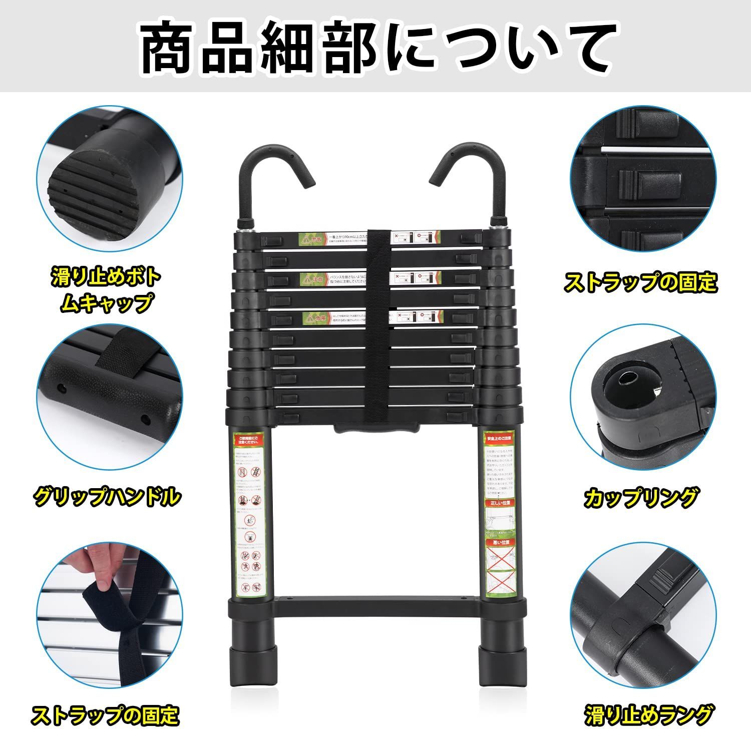 軽量 持ち運びやすい 折り畳み 耐荷重150 kg 伸縮梯子 アルミはしご 自動ロック 伸縮はしご スライド式 伸縮自在 梯子 RIKADE 室内室外両用 フック付き ブラック 3 8m
