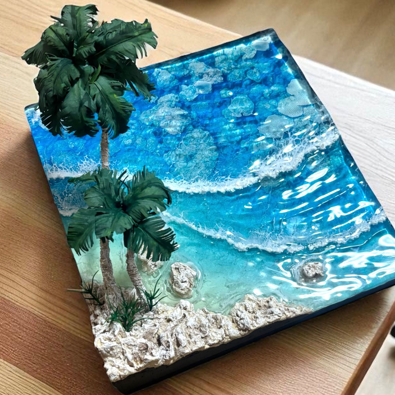 通常の平面レジンアートとは異なり立体的な加工を施したリアルな海になっています。