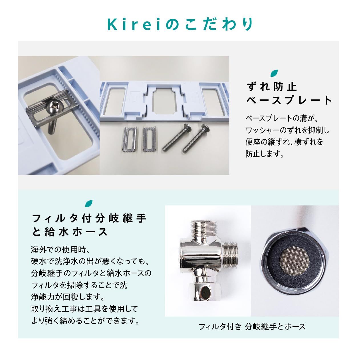 内容品:①Kirei本体×1 ②便座取り付け位置決めシート×1 ③便座取り付けボルト×2 ④調整ワッシャ×2 ⑤アンカープラグ×2 ⑥ナット×2 ⑦ 便座取り付けプレート×1 ⑧プラスチック製分岐綱手×1 ⑨本体給水ホース×1 ⑩取扱説明書×1