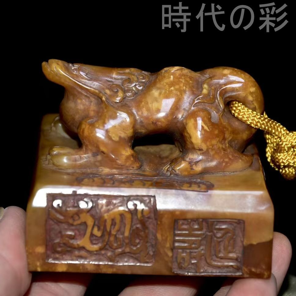 寿山田黄石 印章。康熙元年内務府造。精密彫刻と自然包漿。血絲紋美しく歴史的価値高い逸品。
