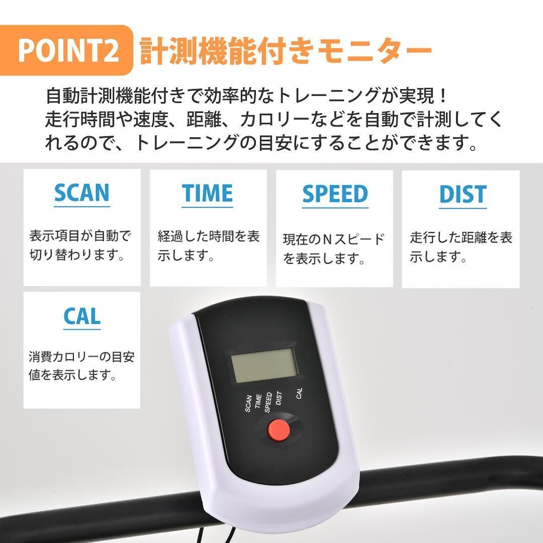 【計測機能付きモニター】走行時間や速度、距離、カロリーなどを自動で計測してくれるので、トレーニングの目安にすることができます。 自動計測機能付きで 効率的なトレーニングが実現!