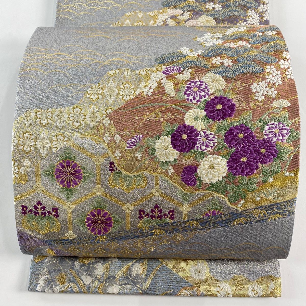 袋帯 秀品 じゅらく 落款 証紙 帝王紫 川島織物 草花 七宝文 刺繍 金糸 灰紫 お太鼓柄 正絹