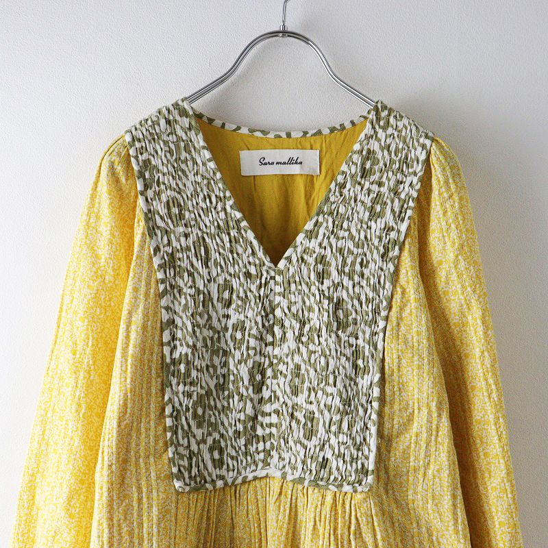 サラマリカ sara mallika ダブルフラワープリントワンピース イエロー トップス ドレス Vネック ギャザー 長袖