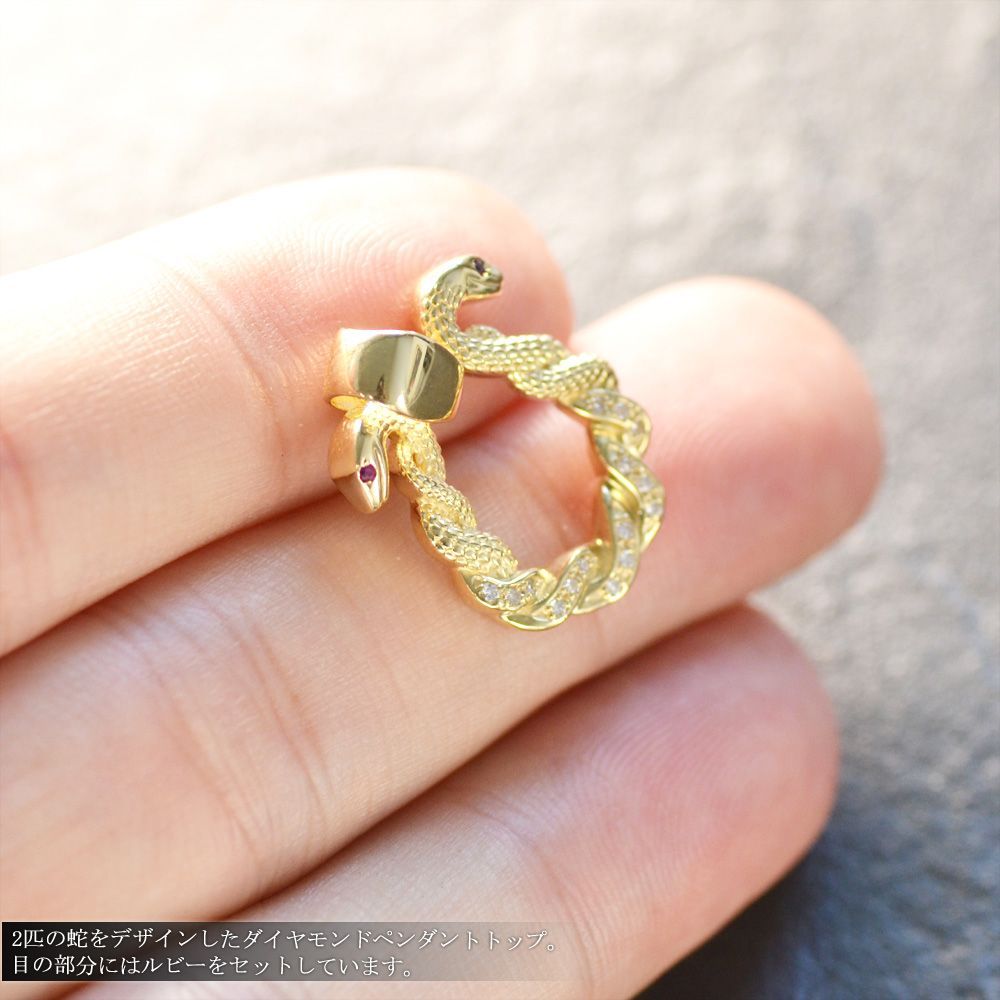 18金を使ったスネークモチーフペンダントトップです。2匹の蛇が絡み合う様子を細部まで丁寧に表現したお勧めデザイン。蛇らしい曲線を描くフォルムや鱗の細やかさは思わず見入ってしまう程。両目にセットしたルビーと胴体に散りばめたダイヤモンドが質感を高め力強さと品を兼ね備えたペンダントトップに仕上がりました。装着すると胸元で程よい存在感を感じ遠目には馬蹄のようなフォルムを描くデザイン。軽量で普段使いに最適です。