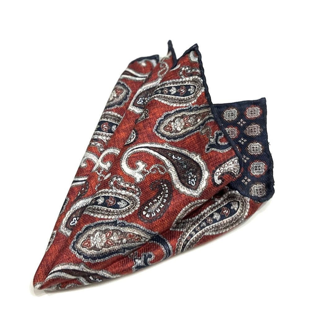 ROSI COLLECTION ロージ ポケットチーフ ネイビー 小紋柄 裏 テラコッタ ペイズリー柄 ダブルフェイス シルク ハンドメイド イタリア製