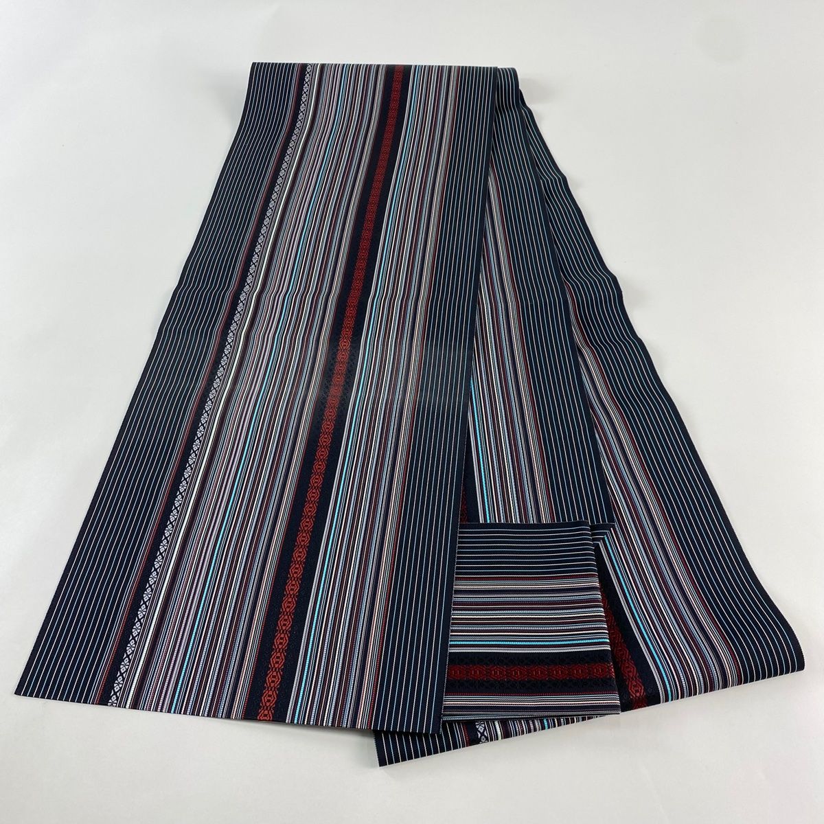 名古屋帯 八寸名古屋帯 松葉仕立て 縞 幾何学模様 黒 正絹